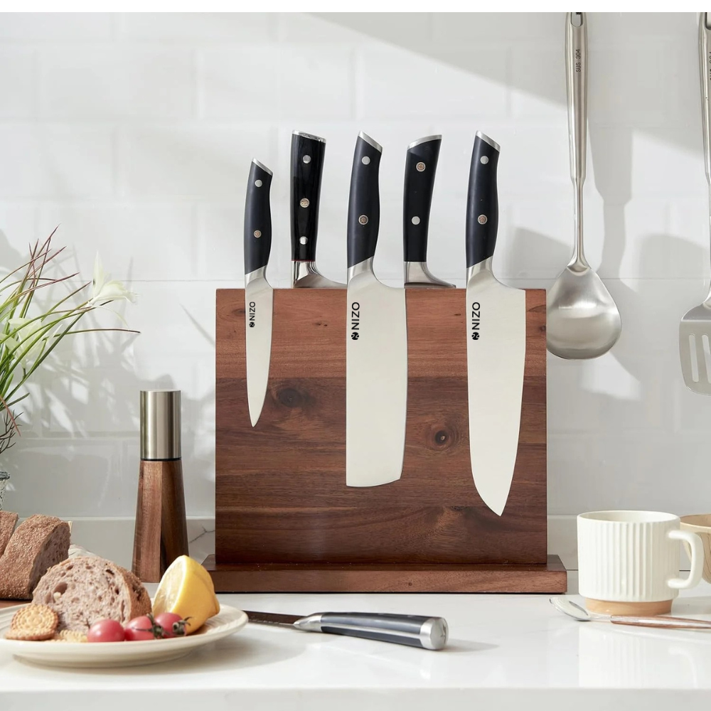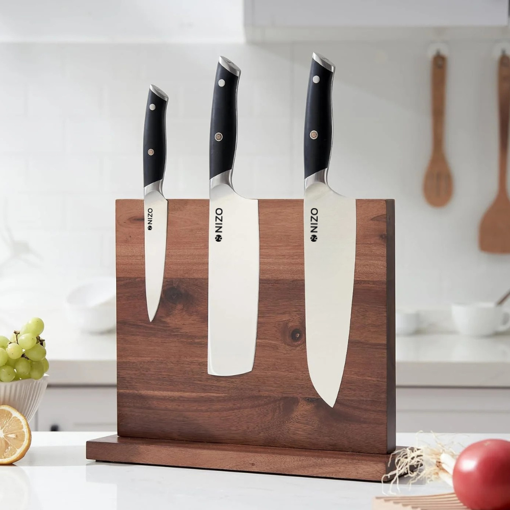 Izgatavots no dabīga akācijas koka, šis divpusējais magnētiskais statīvs palīdz uzturēt kārtību virtuvē, vienlaikus aizsargājot nažu asmeņus. Pateicoties kokā paslēptajiem spēcīgajiem magnētiem, naži un citi virtuves rīki droši turas savā vietā.